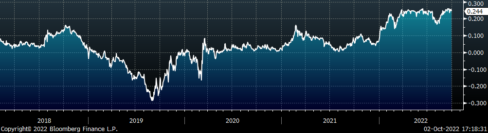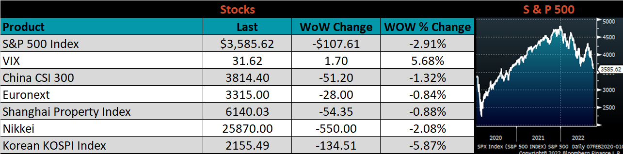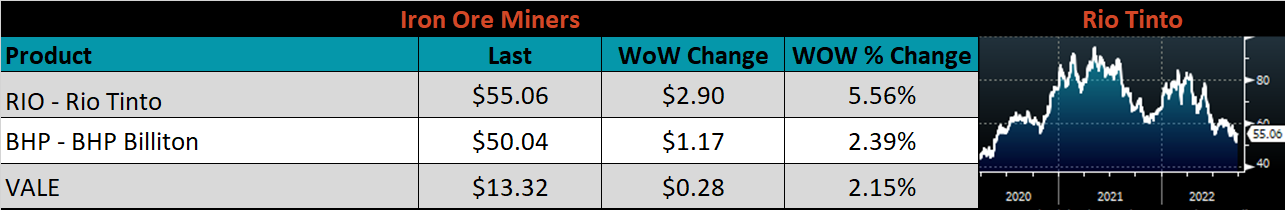 Below is the iron ore future curve with Friday’s settlements in orange, and the prior week’s settlements in green. Last week, the entire curve shifted lower again, most significantly in the back of the curve.