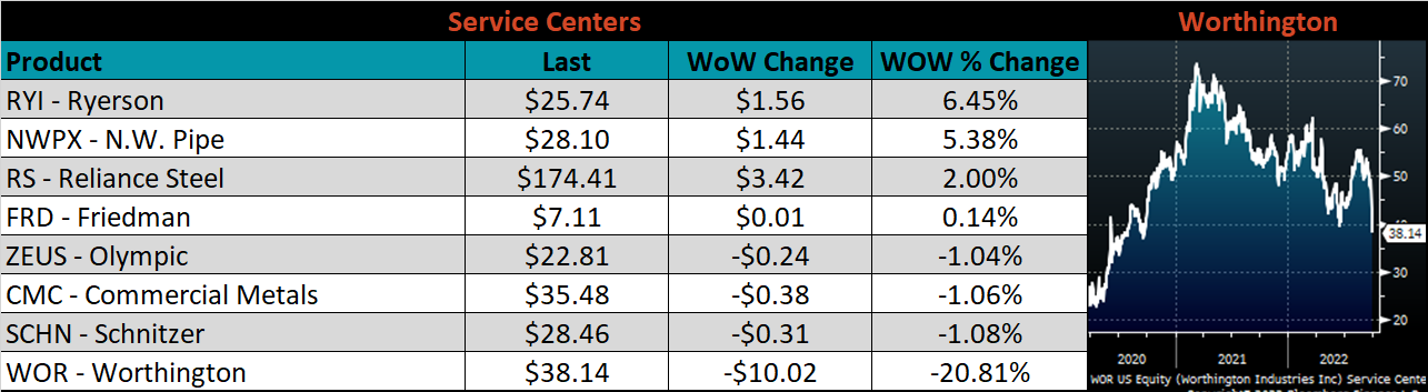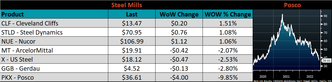 Below is the Midwest HRC price vs. each listed country’s export price using pricing from SBB Platts. We have adjusted each export price to include any tariff or transportation cost to get a comparable delivered price. Differentials decreased slightly for all the watched countries, apart from Northern Europe, and China which were both weaker than U.S. domestic HRC.