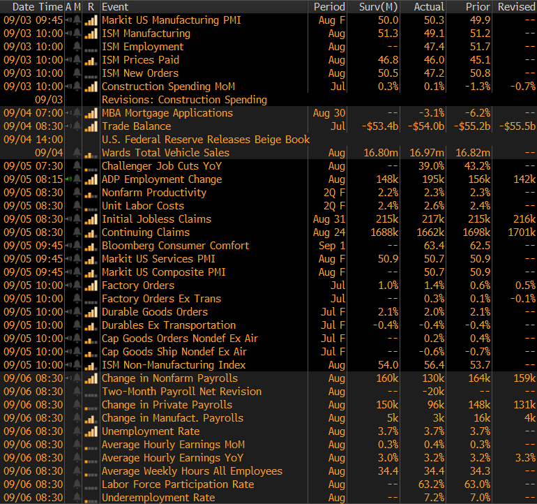 The August ISM Manufacturing PMI and subindexes are below. The sharp decline in the manufacturing index is the first contraction print since August 2016, and the lowest since January 2016. The only subindex still printing in expansion was supplier deliveries. New export orders, employment and new orders slowed the most, down 4.8, 4.3 and 3.6 points, respectively.