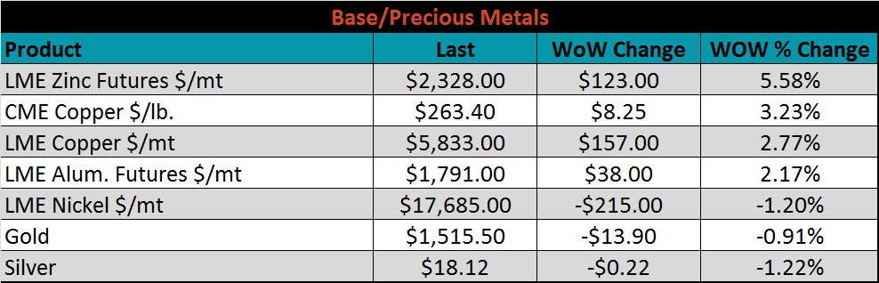 SBB Platt’s HRC, CRC and HDG pricing is below. The Midwest HRC, HDG and CRC prices were down on the week 2.8%, 1% and 0.3%, respectively. The Turkish HRC and Chinese HDG prices were both lower 6.2% and 5.9%, respectively.