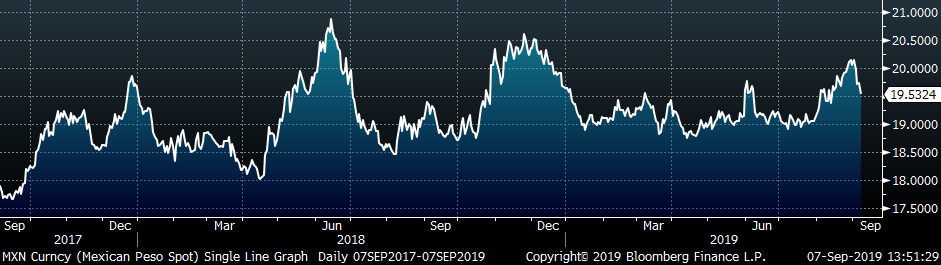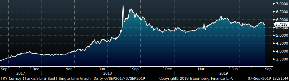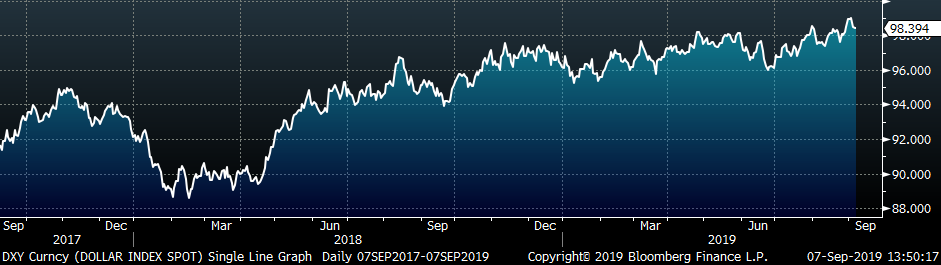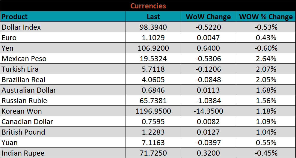 The U.S. dollar lost 0.52 to 98.39 while the Mexican peso and Turkish lira were each up, 2.6% and 2.1%, respectively.