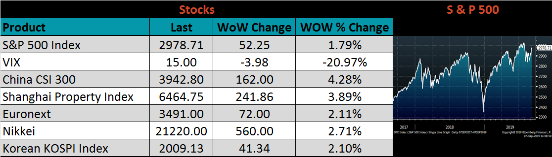 The U.S. 10-year yield was up 6 bps, closing the week at 1.56%. The German 10-year yield was up 6 bps to minus 0.70% and the Japanese 10-year yield was up 3 bps to minus 0.24%.