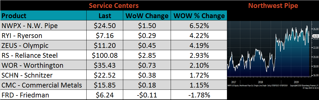 Below is the Midwest HRC price vs. each listed country’s export price using pricing from SBB Platts. We have adjusted each export price to include any tariff or transportation cost to get a comparable delivered price. The Midwest HRC price has continued to decline over the previous four weeks. Turkish export prices were significantly lower, while the remaining global prices have remained stable.