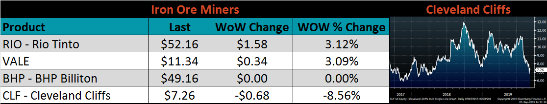 Below are inventory levels for Chinese finished steel products and iron ore. HRC, Rebar and 5-City inventory levels were lower again, while Iron Ore port inventory has continued to increase. Another month of poor manufacturing data suggests that the trend of destocking finished products will likely continue.