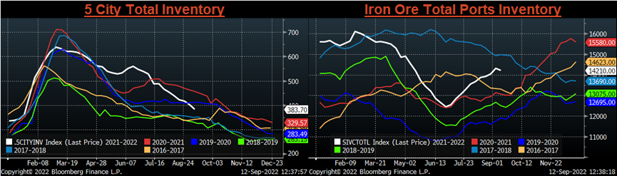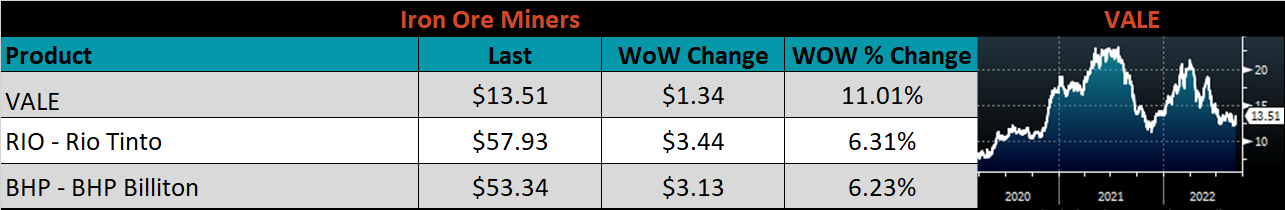 Below is the iron ore future curve with Friday’s settlements in orange, and the prior week’s settlements in green. Last week, the entire curve rebounded sharply higher, this was an anomily as most of the steel raw materials were weak.