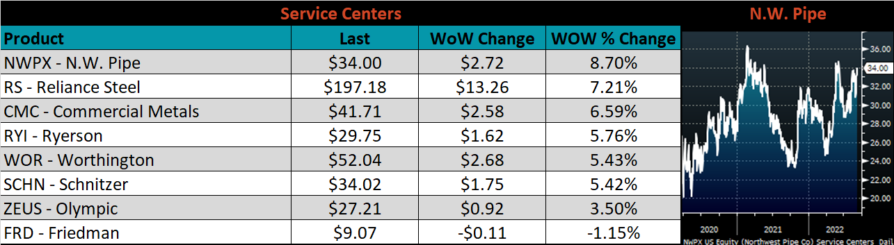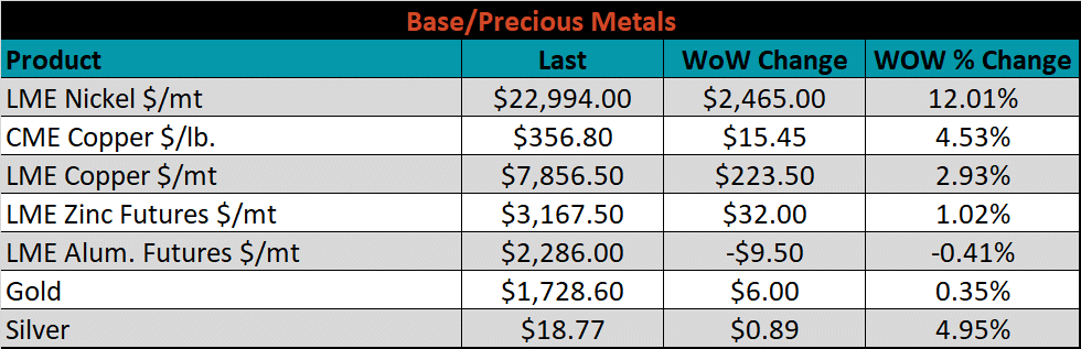 SBB Platt’s HRC, CRC, and HDG pricing is below. The Midwest HRC was up 2.5%, while the CRC & HDG prices were unchanged on the week.