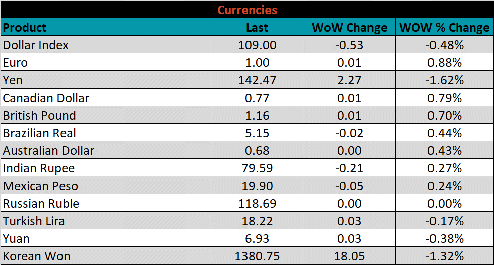 Below is the Midwest HRC price vs. each listed country’s export price using pricing from SBB Platts. We have adjusted each export price to include any tariff or transportation cost to get a comparable delivered price. Differentials increased last week for most of the watched countries, as the U.S. Midwest price continued it’s rise above $800. Russia and Turkey were the two countries that saw a decrease in their differential.