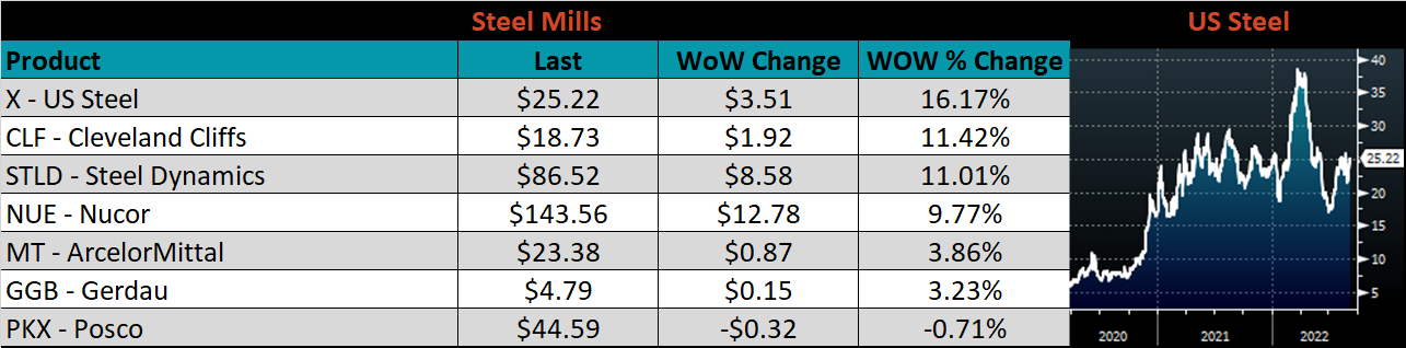 The CME Midwest HRC futures curve is below, with last Friday’s settlements in white. The majority of curve shifted higher, most significantly in the front, which led to an overall flattening of the curve.